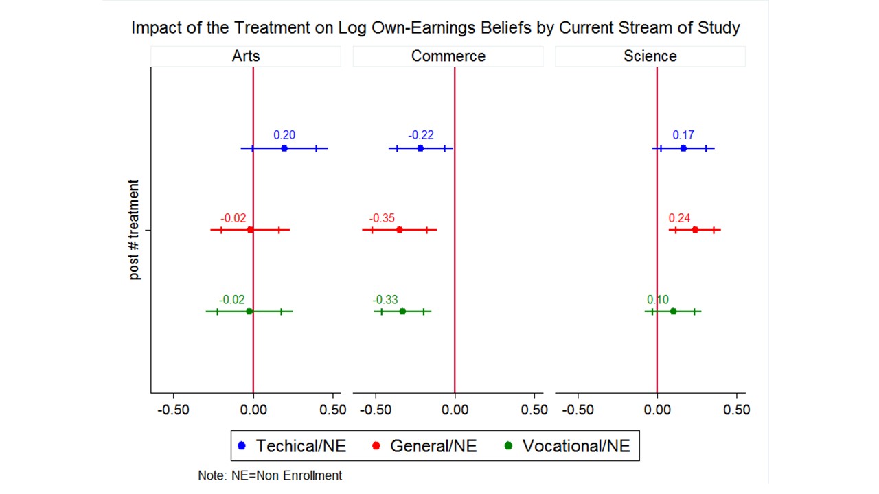Within each sub-group, revisions in enrollment intentions are small but statistically significant and in line with the direction of earnings-beliefs. Commerce students are more likely to “not-enroll” and Science students are less likely to “not-enroll”. The average impact of the treatment on borrowing intentions is positive, economically important, and driven entirely by Science students, who are around 15 percentage points more likely to borrow than their control group counterparts.